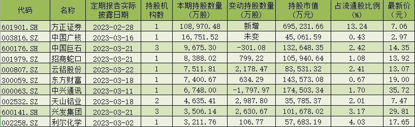 業(yè)績(jī)方面,上述社?;鸪謧}(cāng)的50家公司中,2022年業(yè)績(jī)均實(shí)現(xiàn)盈利,其中,大全能源、中國(guó)廣核、東方財(cái)富、中興通訊、智飛生物、中信特鋼等6家公司去年歸母凈利潤(rùn)均超70億元;34家公司2022年全年實(shí)現(xiàn)歸母凈利潤(rùn)同比增長(zhǎng),占比近七成。其中,5家公司報(bào)告期內(nèi)實(shí)現(xiàn)歸母凈利潤(rùn)同比翻番,分別為藏格礦業(yè)、安道麥A、大全能源、長(zhǎng)青集團(tuán)、宏柏新材。