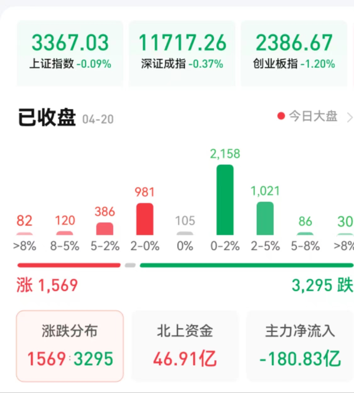 周四(4月20日),A股三大股指繼續(xù)震蕩整理。截至收盤,上證指數(shù)跌0.09%報3367.03點,深證成指跌0.37%報11717.26點,創(chuàng)業(yè)板指跌1.20%報2386.67點,滬深兩市合計成交額11386.85億元,連續(xù)第13個交易日突破萬億元,北向資金凈買入46.91億元。總體上看,兩市個股跌多漲少。其中,漲停個股達36只,跌停個股達25只。