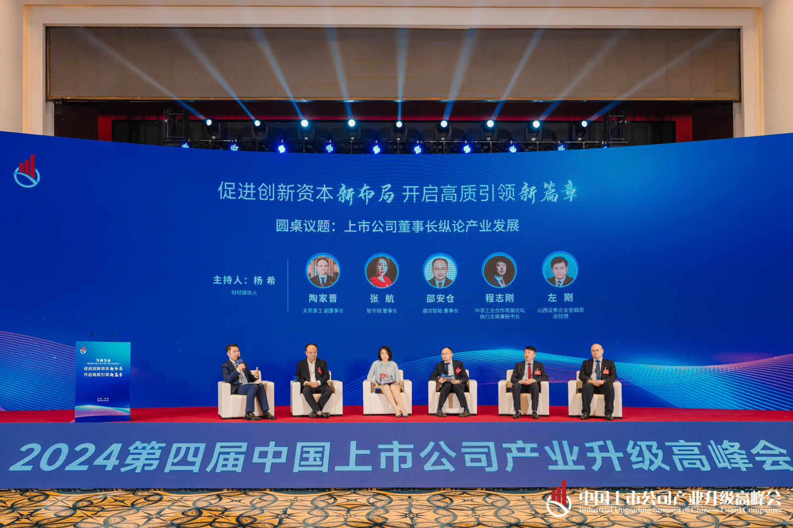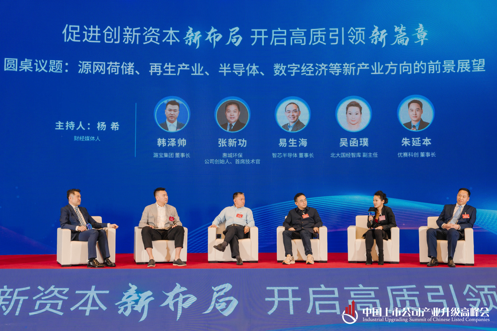 本場論壇的主題是新質(zhì)生產(chǎn)力發(fā)展論壇,探討一下源網(wǎng)荷儲、再生產(chǎn)業(yè)、半導(dǎo)體、數(shù)字經(jīng)濟等新產(chǎn)業(yè)的方向。首先有請參與本場論壇的各位對話嘉賓,他們分別是:潞寶集團董事長韓澤帥;惠城環(huán)保董事長張新功;智芯半導(dǎo)體董事長易生海;國經(jīng)智庫副主任吳函璞;優(yōu)賽科創(chuàng)董事長朱延本。