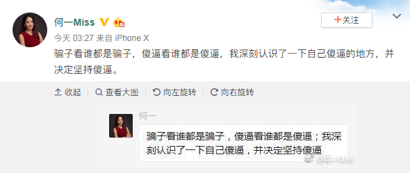 7月4日上午消息,在李笑來割韭菜錄音曝光后,幣安Binance聯(lián)合創(chuàng)始人何一、波場創(chuàng)始人孫宇晨紛紛發(fā)表微博,疑似做出回應(yīng)。何一表示:"騙子看誰都是騙子,傻逼看誰都是傻逼,我深刻認(rèn)識了一下自己傻逼的地方,并決定堅(jiān)持傻逼。 "