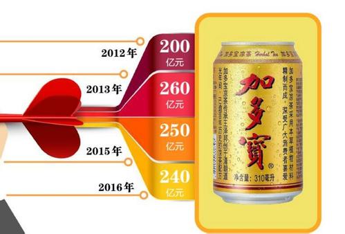 據(jù)媒體此前報道,2015年加多寶的銷售額在250億元左右。另外,加多寶在2017年3月的一次公開會議上表示其2016年的銷售收入是240億元。而內(nèi)部人士透露,加多寶2017年的銷售總收入預(yù)計在150億元左右。