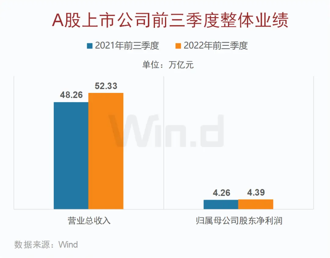 截至2022年10月30日晚,全部A股4973家上市公司,已有4963家披露2022年三季報(bào)數(shù)據(jù)。Wind數(shù)據(jù)顯示,2022年前三季度,A股上市公司合計(jì)實(shí)現(xiàn)營業(yè)總收入52.33萬億元,同比增長8.5%;合計(jì)實(shí)現(xiàn)凈利潤4.39萬億元,同比增長3.08%。其中,科創(chuàng)板、創(chuàng)業(yè)板和北交所營收、凈利潤增速均好于主板;半導(dǎo)體、能源行業(yè)齊頭并進(jìn),前三季度業(yè)績強(qiáng)勁增長。...>>詳情