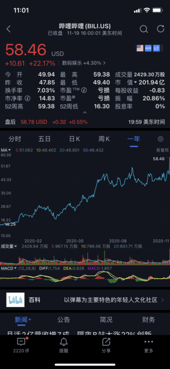 截至美東時(shí)間11月19日收盤(pán),B站股價(jià)較前一交易日上漲22.17%,報(bào)58.46美元,創(chuàng)下歷史新高。2020年初至今,B站股價(jià)累計(jì)漲幅已超200%。目前,B站市值已突破200億美元。