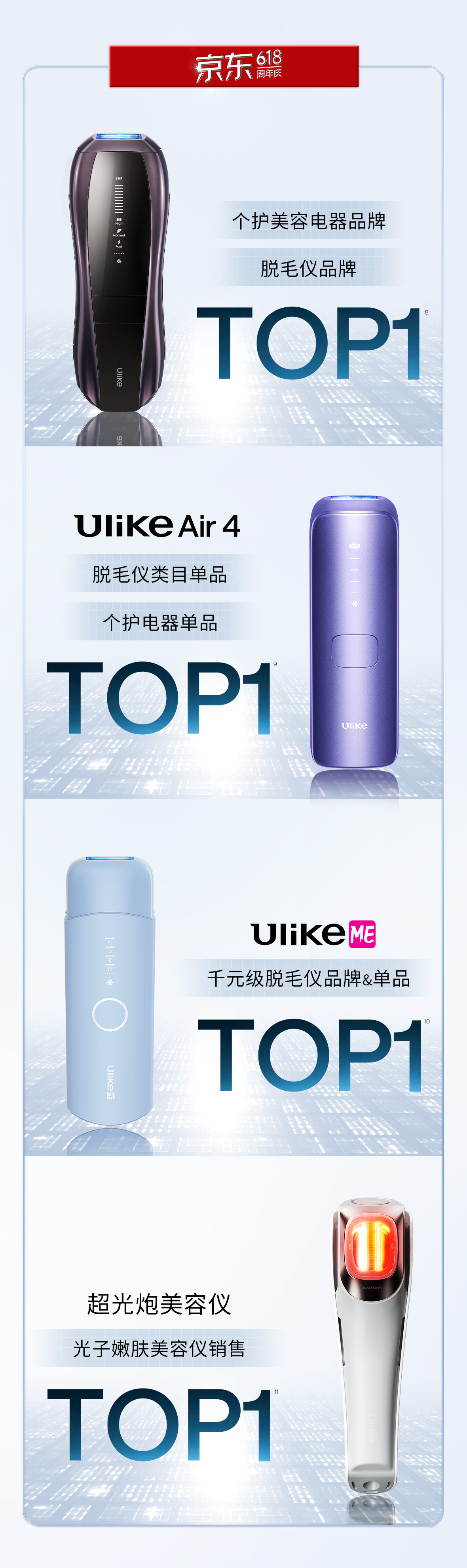 Ulike斬獲京東平臺(tái)“個(gè)護(hù)美容電器品牌”“脫毛儀品牌”“脫毛儀類目單品”“個(gè)護(hù)電器單品”“千元級(jí)脫毛儀品牌&單品”等多個(gè)榜單榜首;Ulike超光炮美容儀獲得“光子嫩膚美容儀”銷售Top1。