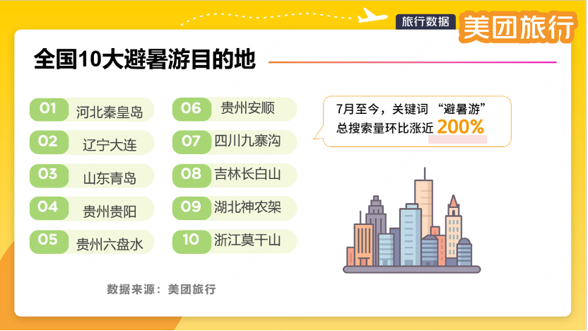 據(jù)美團旅行數(shù)據(jù),今年夏天,Top10熱門避暑目的地分別為:河北秦皇島、遼寧大連、山東青島、貴州貴陽、貴州六盤水、貴州安順、四川九寨溝、吉林長白山、湖北神農(nóng)架、浙江莫干山,熱門避暑清涼景區(qū)有清遠古龍峽、青海湖二郎劍景區(qū)、霍山大峽谷漂流、婺女洲度假區(qū)、玉龍雪山國家風景名勝區(qū)、潿洲島等,多個有漂流體驗的景區(qū)都有上榜。