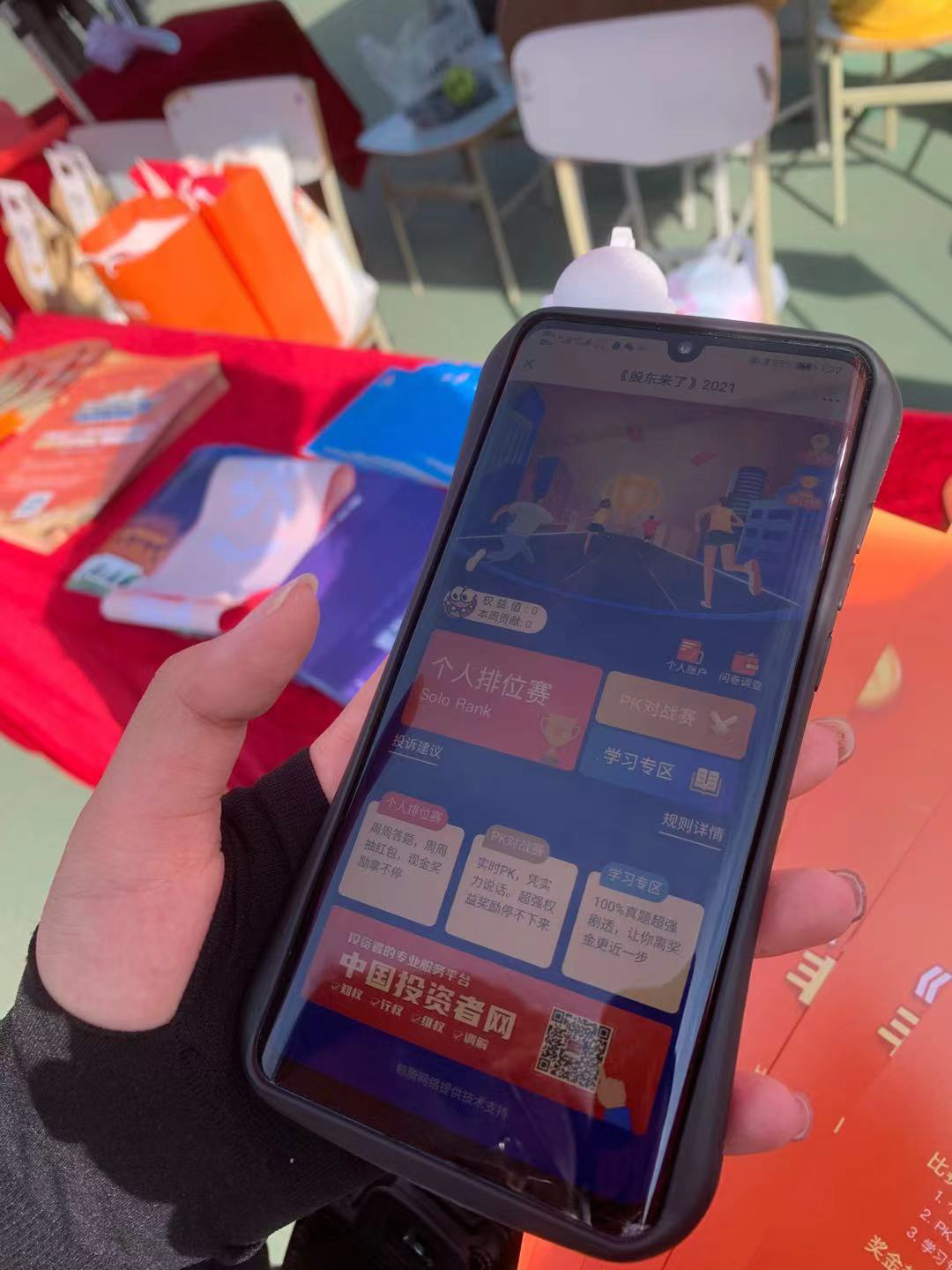 工作人員迎著晨光,在活動(dòng)現(xiàn)場(chǎng)設(shè)置《股東來(lái)了》知識(shí)競(jìng)賽活動(dòng)專區(qū),動(dòng)員參賽隊(duì)員及廣大師生積極參與。同學(xué)們對(duì)此項(xiàng)活動(dòng)表現(xiàn)出了極大的熱情,紛紛主動(dòng)嘗試進(jìn)行掃碼注冊(cè),工作人員也隨時(shí)對(duì)注冊(cè)各個(gè)環(huán)節(jié)進(jìn)行協(xié)助,完成注冊(cè)工作。