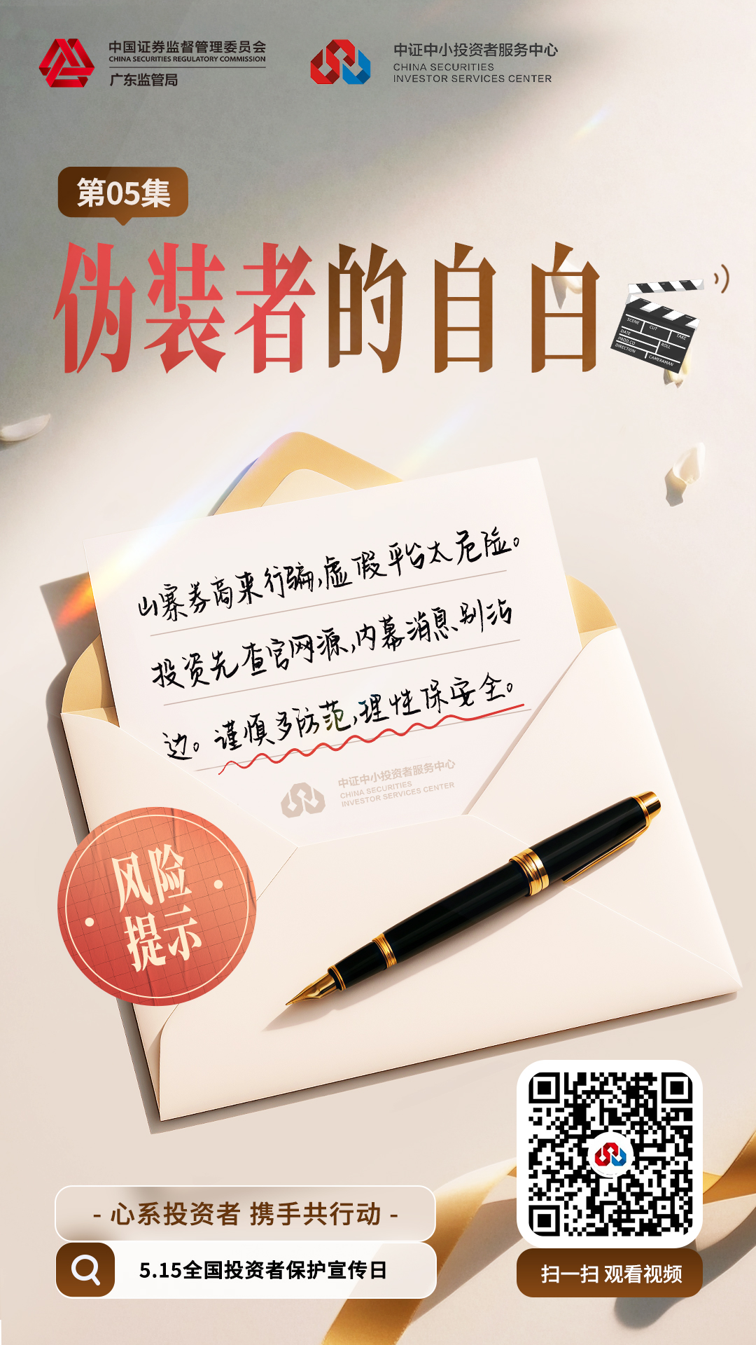 在5·15全國(guó)投資者保護(hù)宣傳日來臨之際,中證中小投資者服務(wù)中心聯(lián)合廣東證監(jiān)局推出《股東來了》(2025)《防非打非在行動(dòng)!》系列短視頻,聚焦股市“黑嘴”、非法薦股、股市“小作文”等常見非法證券活動(dòng),揭秘騙局、揭示風(fēng)險(xiǎn),助您樹立理性投資理念。