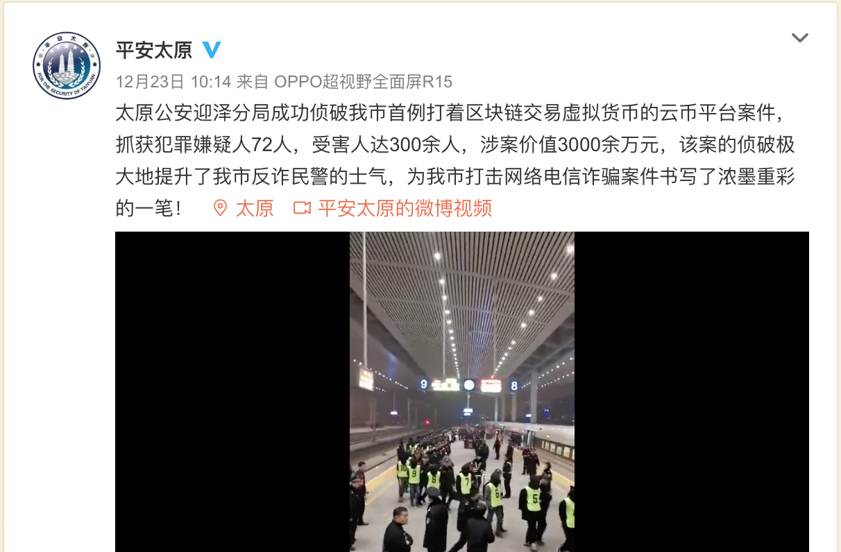 近日,山西省太原市公安局官方微博披露消息稱,太原公安迎澤分局成功偵破該市首例打著區(qū)塊鏈交易虛擬貨幣的云幣平臺(tái)案件,抓獲犯罪嫌疑人72人,受害人達(dá)300余人,涉案價(jià)值3000余萬元。