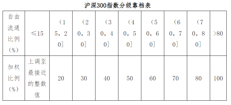 滬深300指數(shù)在確定樣本加權(quán)比例時(shí),采用分級(jí)靠檔的方法,即根據(jù)證券的自由流通量占樣本總股本的比例(即自由流通比例)賦予總股本一定的加權(quán)比例,以確保計(jì)算指數(shù)的股本保持相對(duì)穩(wěn)定。