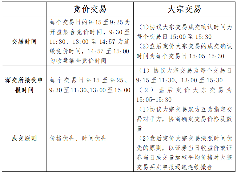 競(jìng)價(jià)交易和大宗交易在交易時(shí)間、申報(bào)時(shí)間、成交原則等方面存在差異,具體如下: